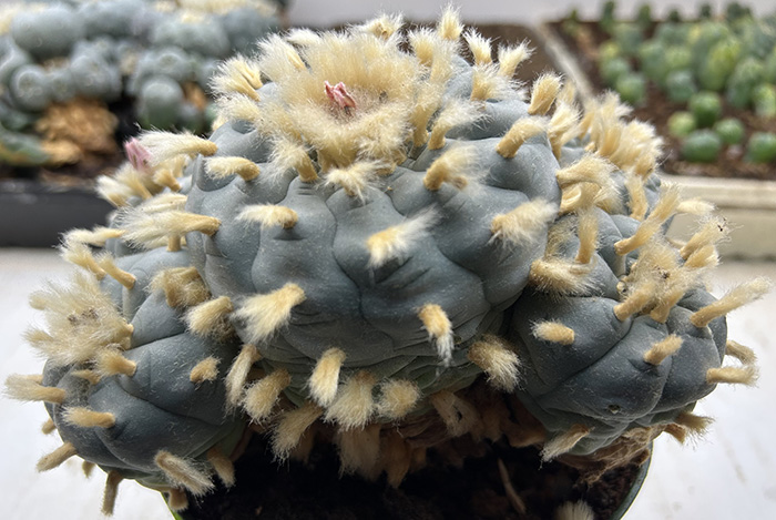Here below is my most recent batch of Lophophora Williamsii, Peyote recently matured plants for sale Updated December 5, 2025. The seeds were planted October 1, 2021. The Peyote plants are now ranging in size from 5 to 6.5cm wide and are flowering and fruiting plants. These are what I consider my "generic Peyote", or typical Peyote plant without location data, and these are what you are growing when you order seeds item #1000